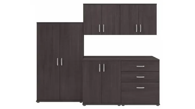 The Bush Business Furniture Universal 92W 5 Piece Modular Storage Set with Floor and Wall Cabinets features commercial quality designs and contemporary styling that suits virtually any home or professional environment.